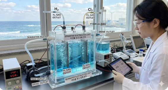 이전까지의 연구들은 대부분 정제된 증류수를 사용하거나 극히 제한적인 환경에서만 이루어졌습니다. 하지만 우리 연구팀은 실제 연안에서 퍼 올린 바닷물을 그대로 전기 화학 반응기에 넣어 인류 최초로 유의미한 가스 생산 결과를 도출해 냈습니다. 이는 이론적인 연구를 넘어 상용화 단계로 가는 가장 큰 문턱을 넘은 것으로 평가받습니다.
