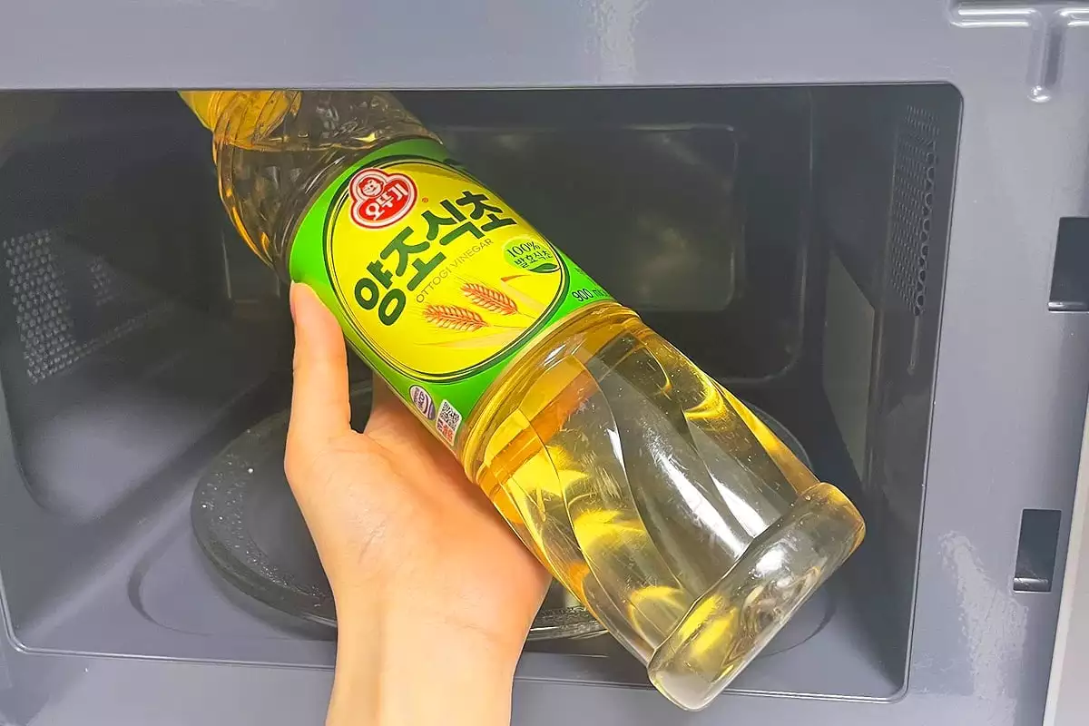 내열 용기에 물 1컵 + 식초 2~3큰술을 넣고 전자레인지에 5분 돌린 후 10분간 문 닫은 채로 두세요. 스팀이 내부에 가득 차서 찌든 냄새와 때를 부드럽게 녹여줍니다. 이후 마른행주로 내부를 닦으면 끝!